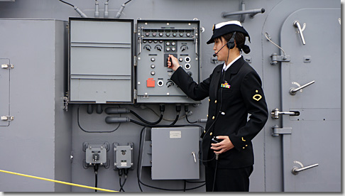 士官の方が、ハンドマイクを使って来艦者を誘導しています。