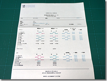 フロント・リヤとも、きちっと基準値に合わせてもらっています。これでタイヤの片減りなどの心配もなく、安心して運転することができます。0xF9C6